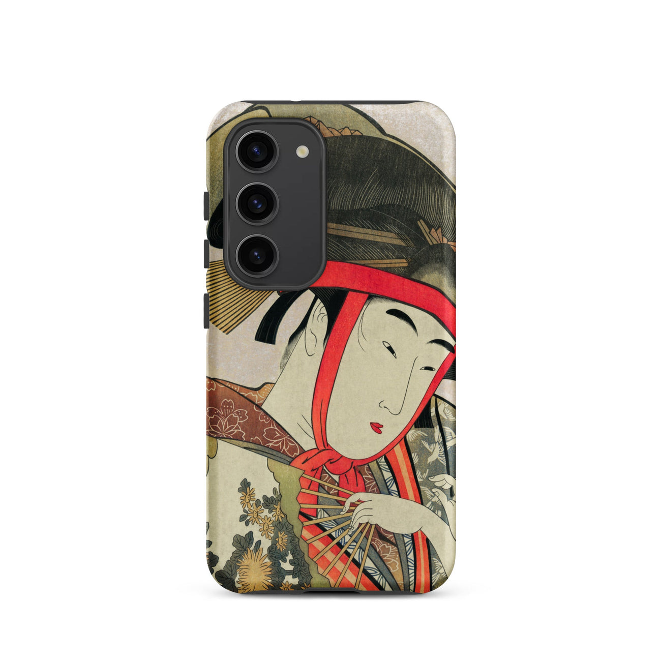 Kitagawa Utamaro’s Yoshiwara Suzume spills across this Samsung case in layered pigments of the Edo night. A courtesan’s gaze drifts sideways, framed by a crimson hood-tie, her fan half-open like an unspoken thought.