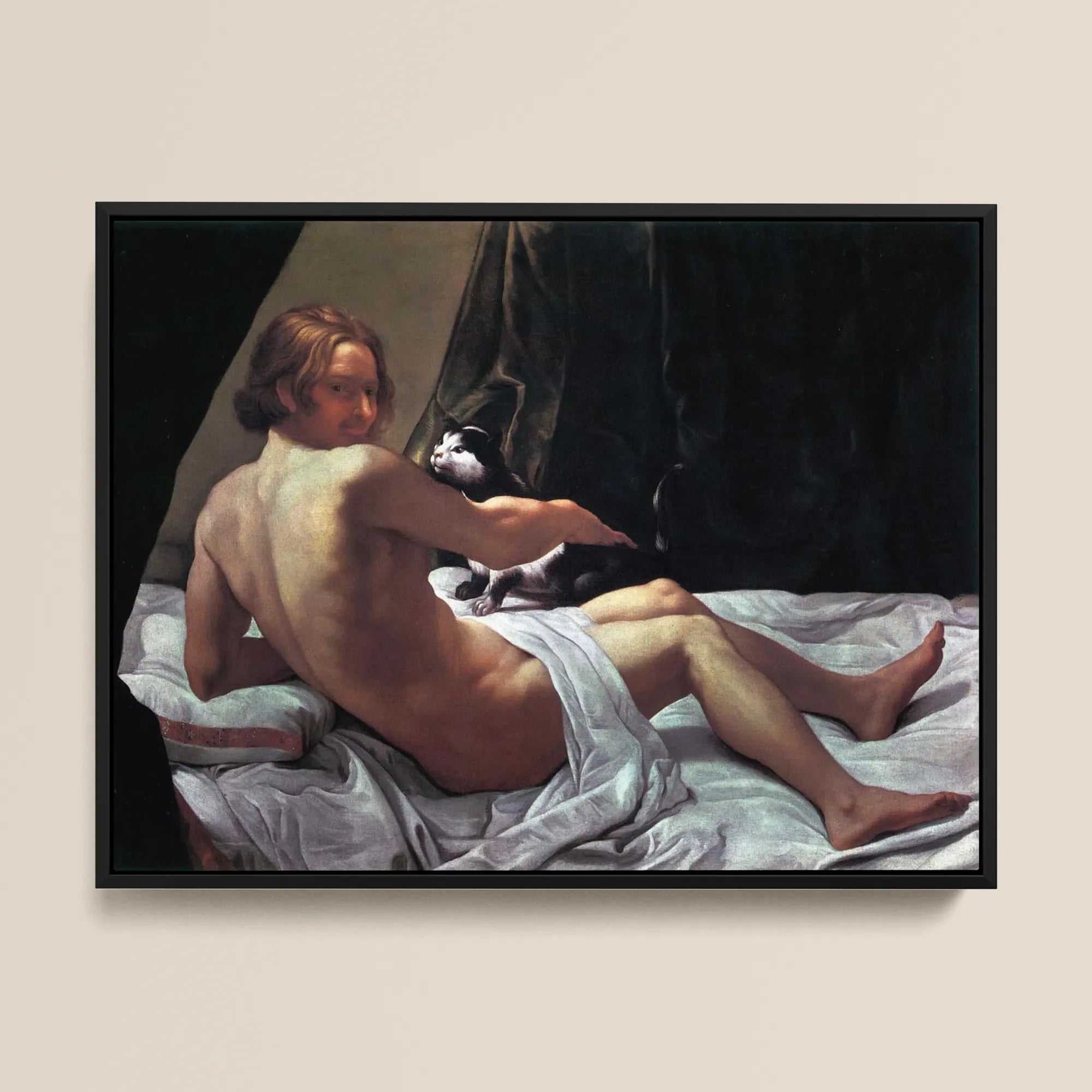 Young Naked Man on a Bed with Cat - Giovanni Lanfranco Framed Canvas