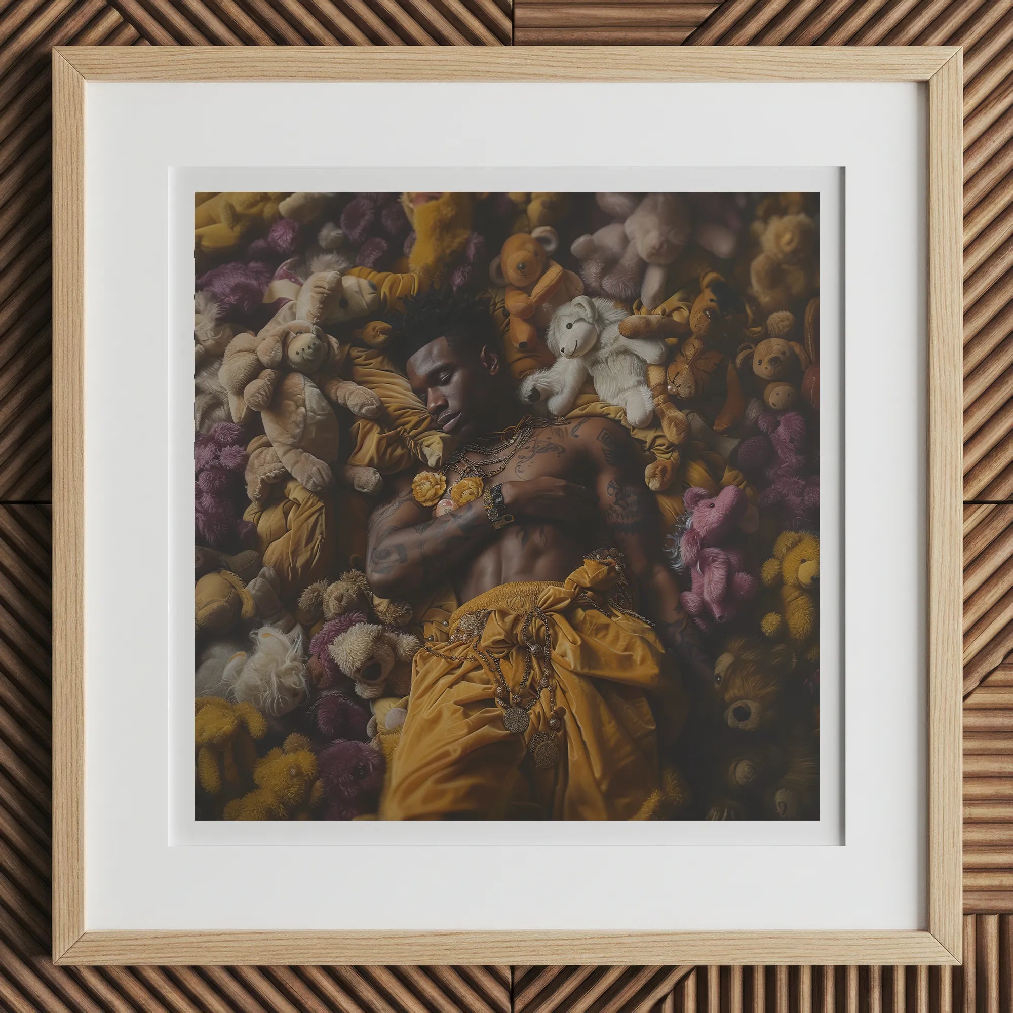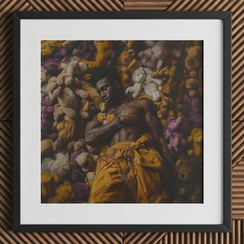 This gay Black punk thrusts you into their dreamlike world—where lowbrow whimsy and sensuality collide. The seemingly innocent stuffed animals, in hues of yellow, purple, and cream, become a surrealist landscape, accentuating his powerful presence—half-clothed, adorned in rich golden fabric.